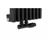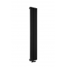 W zestawie: grzejnik dekoracyjny pionowy Diva o wymiarach 180x30 czarny, i zawór termostatyczny zespolony Multiflow w figurze kątowej prawej, czarny.