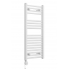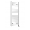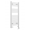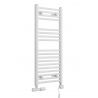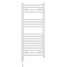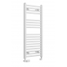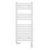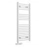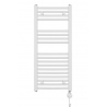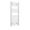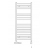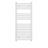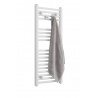 Grzejnik łazienkowy o nowoczesnym kształcie. Szerokie przerwy między poziomymi elementami ułatwiają przewieszanie ręczników. Podłączenie dolne szerokie.