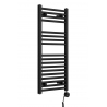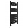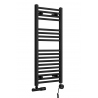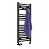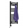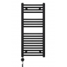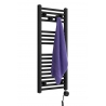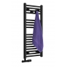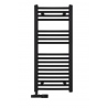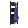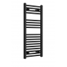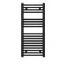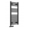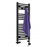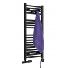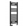 Grzejnik łazienkowy o nowoczesnym kształcie. Szerokie przerwy między poziomymi elementami ułatwiają przewieszanie ręczników. Podłączenie dolne szerokie.