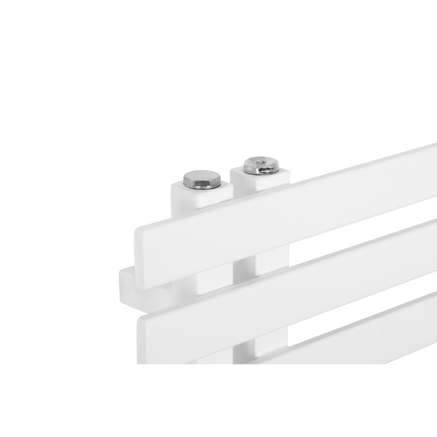 Nowoczesny grzejnik łazienkowy o zbudowany z prostokątnych listew. Asymetryczne usytuowanie pionowych kolektorów grzejnika nadaje mu dekoracyjnego charakteru, a jednocześnie pozwala na łatwiejsze przewieszanie ręczników. Grzejnik o wymiarach 145x50cm o mocy 537W w kolorze białym.