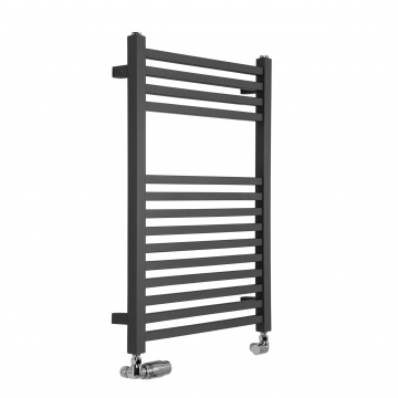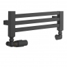 W skład zestawu wchodzi: Grzejnik łazienkowy Essence 70x40 w kolorze grafitowym oraz zawór termostatyczny osiowo lewy, grafit.