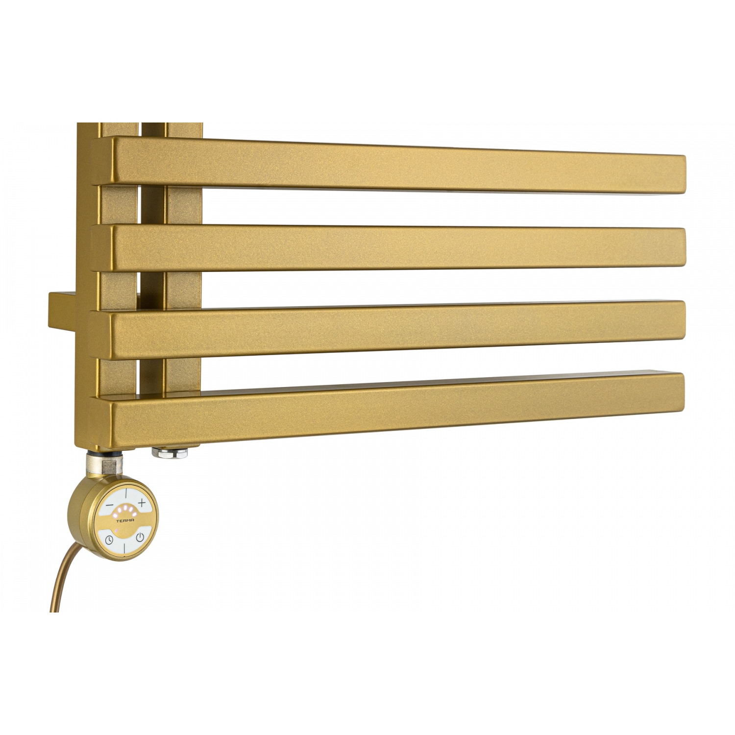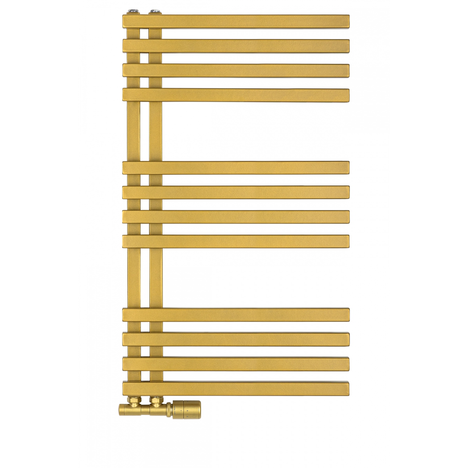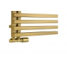 Grzejnik łazienkowy dekoracyjny LOLLY producenta Heat & Style to grzejnik drabinkowy o asymetrycznej, ozdobnej budowie. Ma szerokość 50cm i wysokość 87cm, podłączenie dolne lewe lub prawe, o rozstawie 50mm. Grzejnik posiada moc 375W, ale możliwe jest również zamontowanie grzałki elektrycznej o mocy do 400W. Grzejnik wykonany jest z profili o kwadratowym przekroju i dostępny w kolorze złotym. Jego nowoczesny design sprawia, że doskonale wpasuje się w wystrój każdej łazienki.