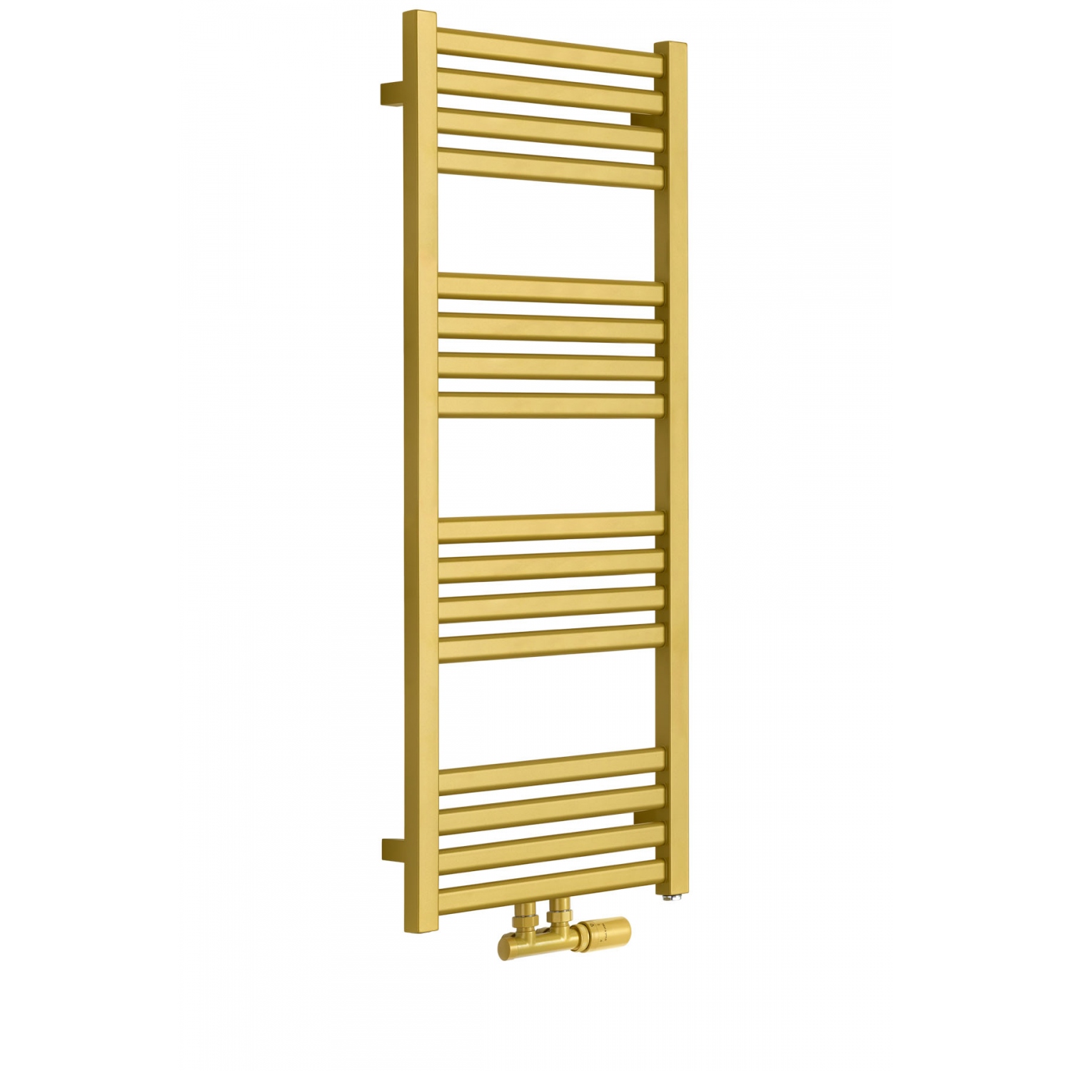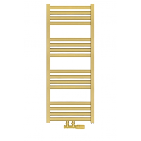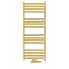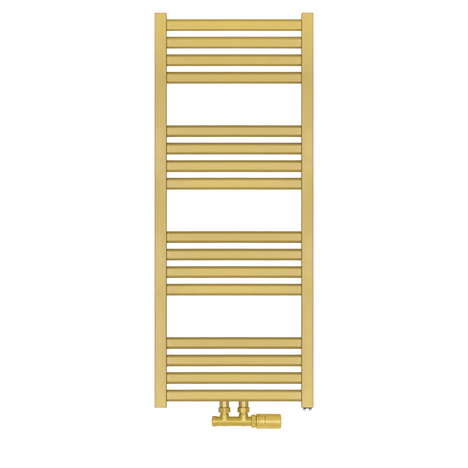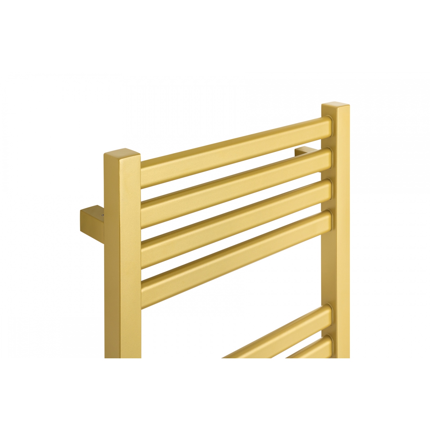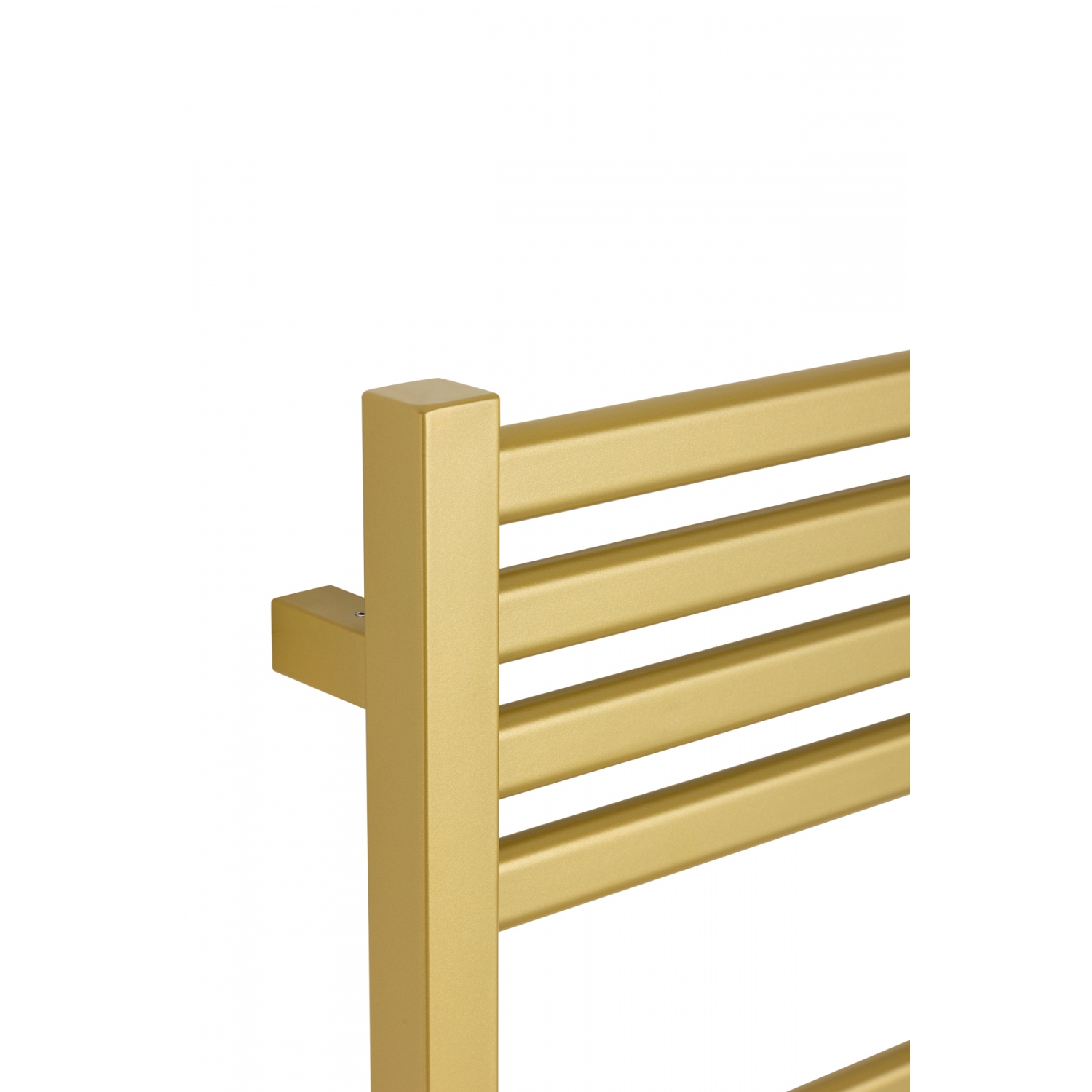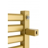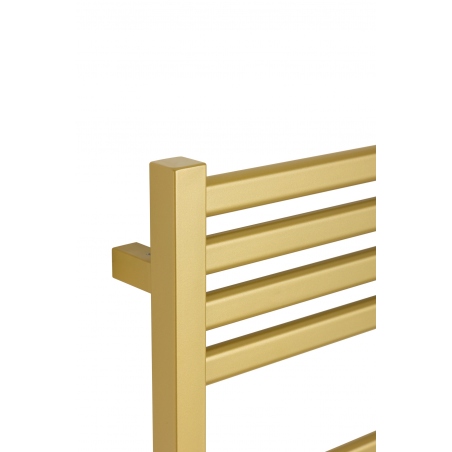 Grzejnik łazienkowy o nowoczesnym kształcie zbudowany z pionowych profili o kwadratowym przekroju i płaskich prostokątnych listew poziomych. Doskonale wkomponuje się we wnętrza współczesnych łazienek. Wersja w kolorze złotym o wymiarach 100x40cm i mocy 375W z podłączeniem dolnym środkowym D50.