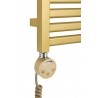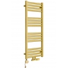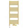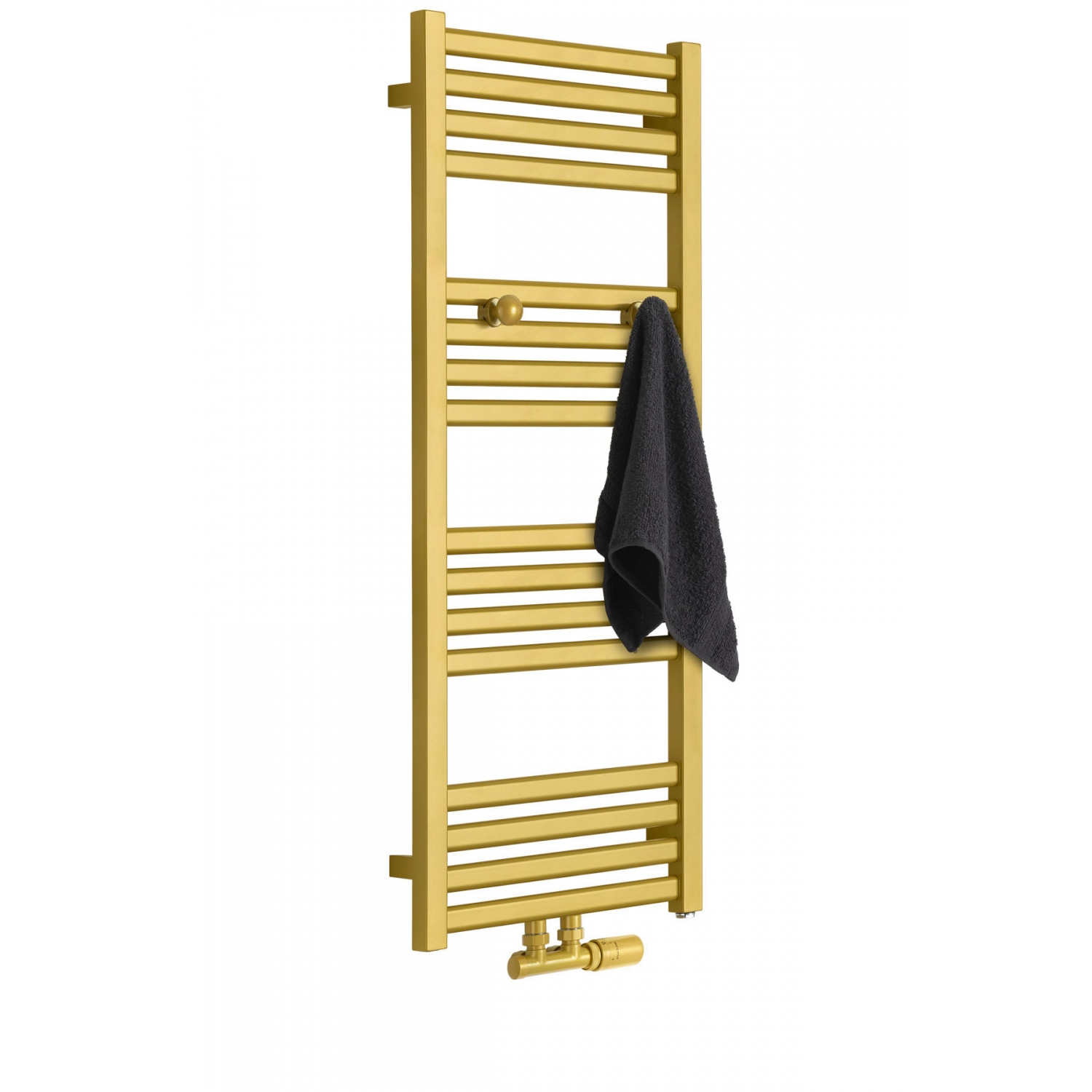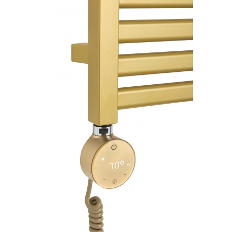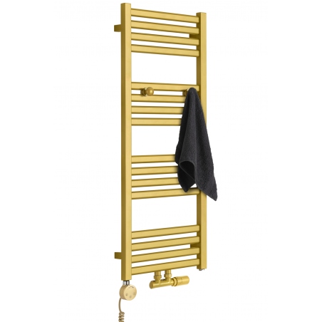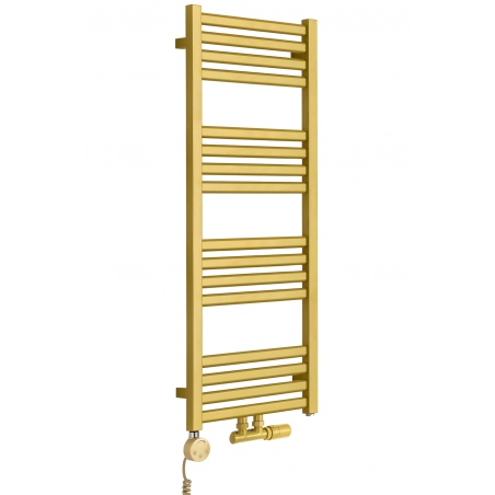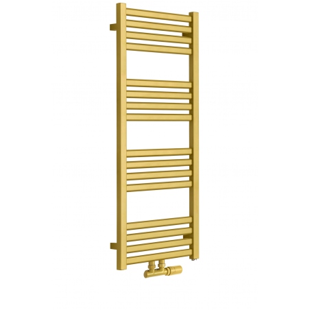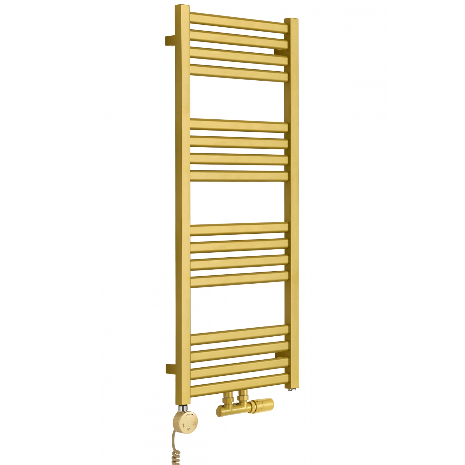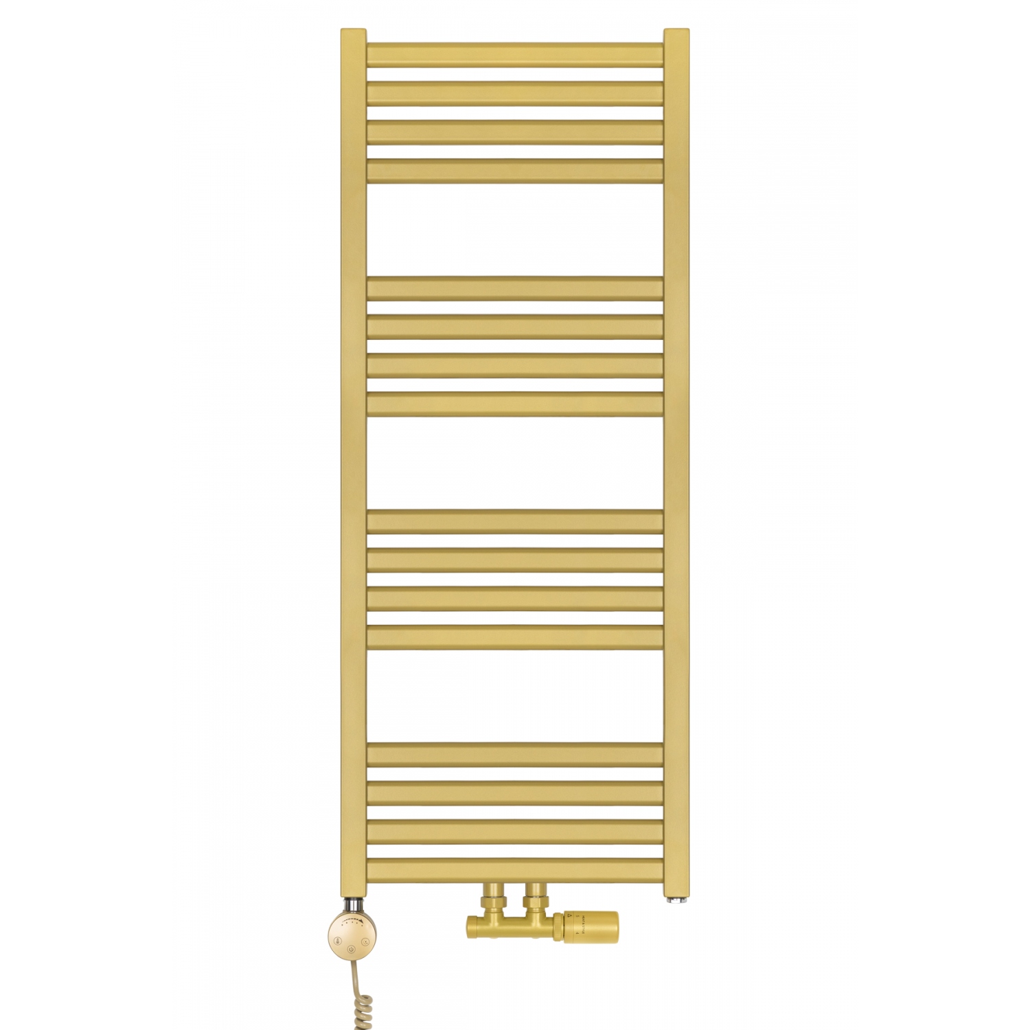 Grzejnik łazienkowy o nowoczesnym kształcie zbudowany z pionowych profili o kwadratowym przekroju i płaskich prostokątnych listew poziomych. Doskonale wkomponuje się we wnętrza współczesnych łazienek. Wersja w kolorze złotym o wymiarach 100x40cm i mocy 375W z podłączeniem dolnym środkowym D50.