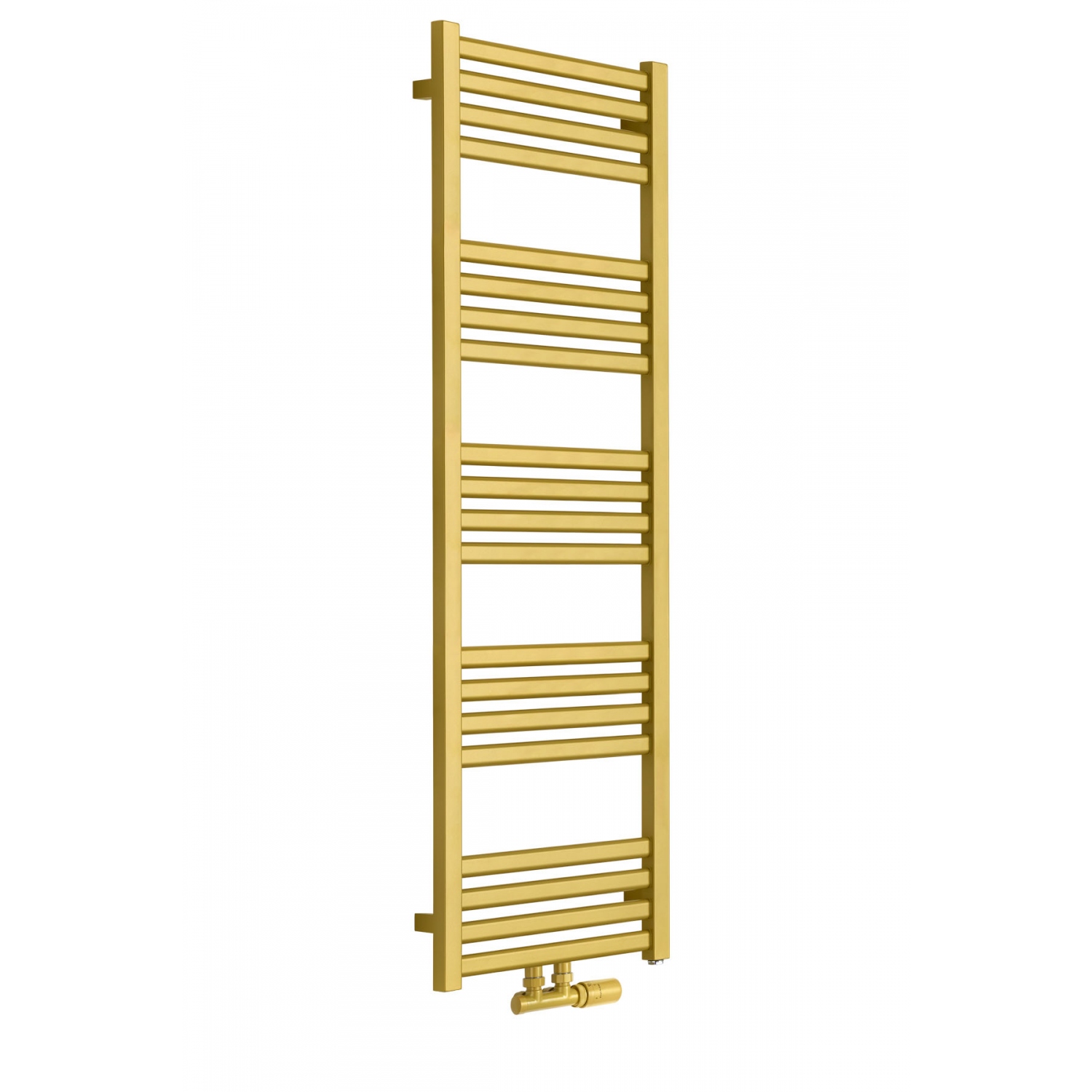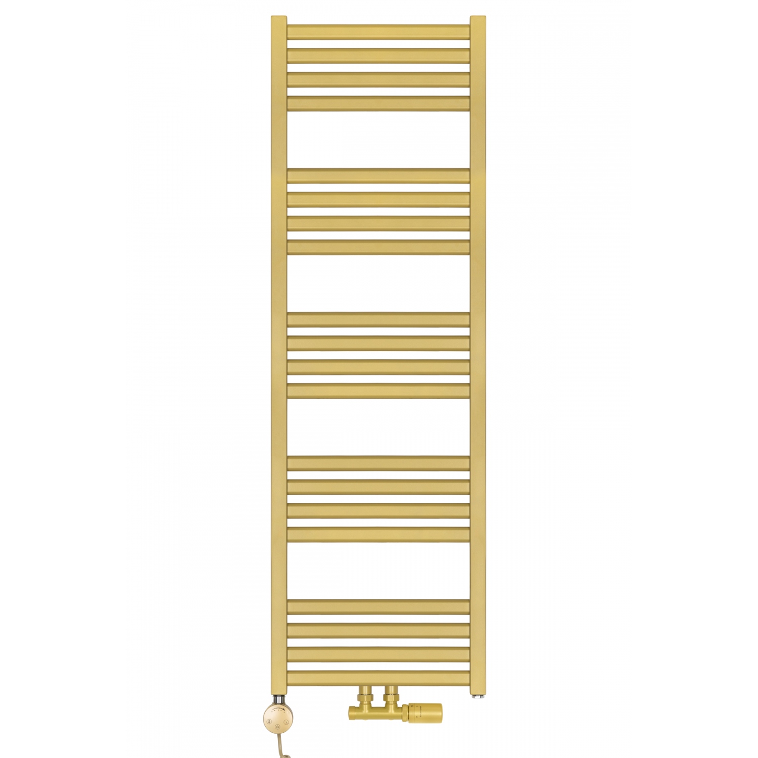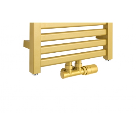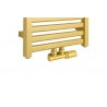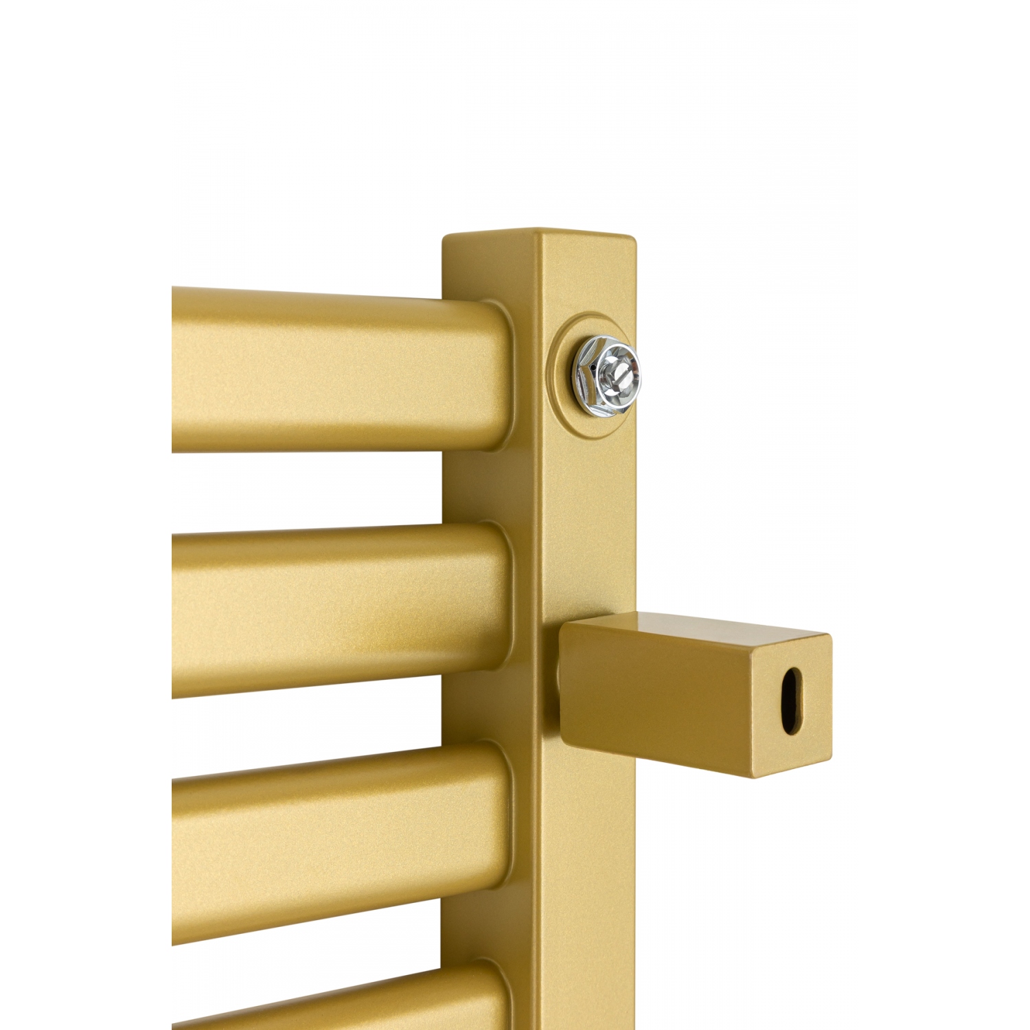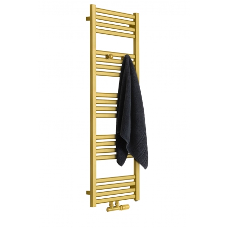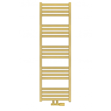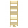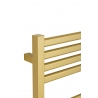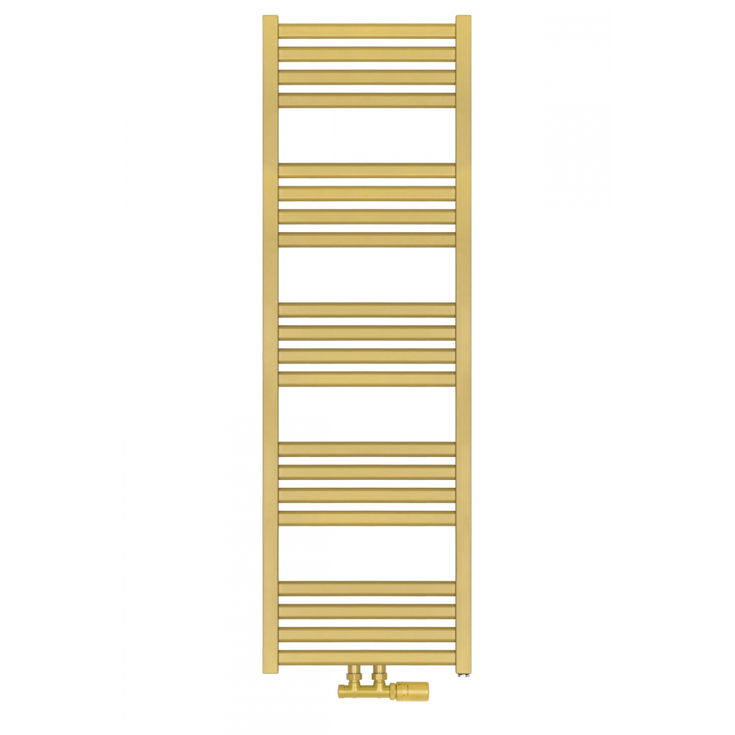 Grzejnik łazienkowy o nowoczesnym kształcie zbudowany z pionowych profili o kwadratowym przekroju i płaskich prostokątnych listew poziomych. Doskonale wkomponuje się we wnętrza współczesnych łazienek. Wersja w kolorze złotym o wymiarach 127x40cm i mocy 424W z podłączeniem dolnym środkowym D50.