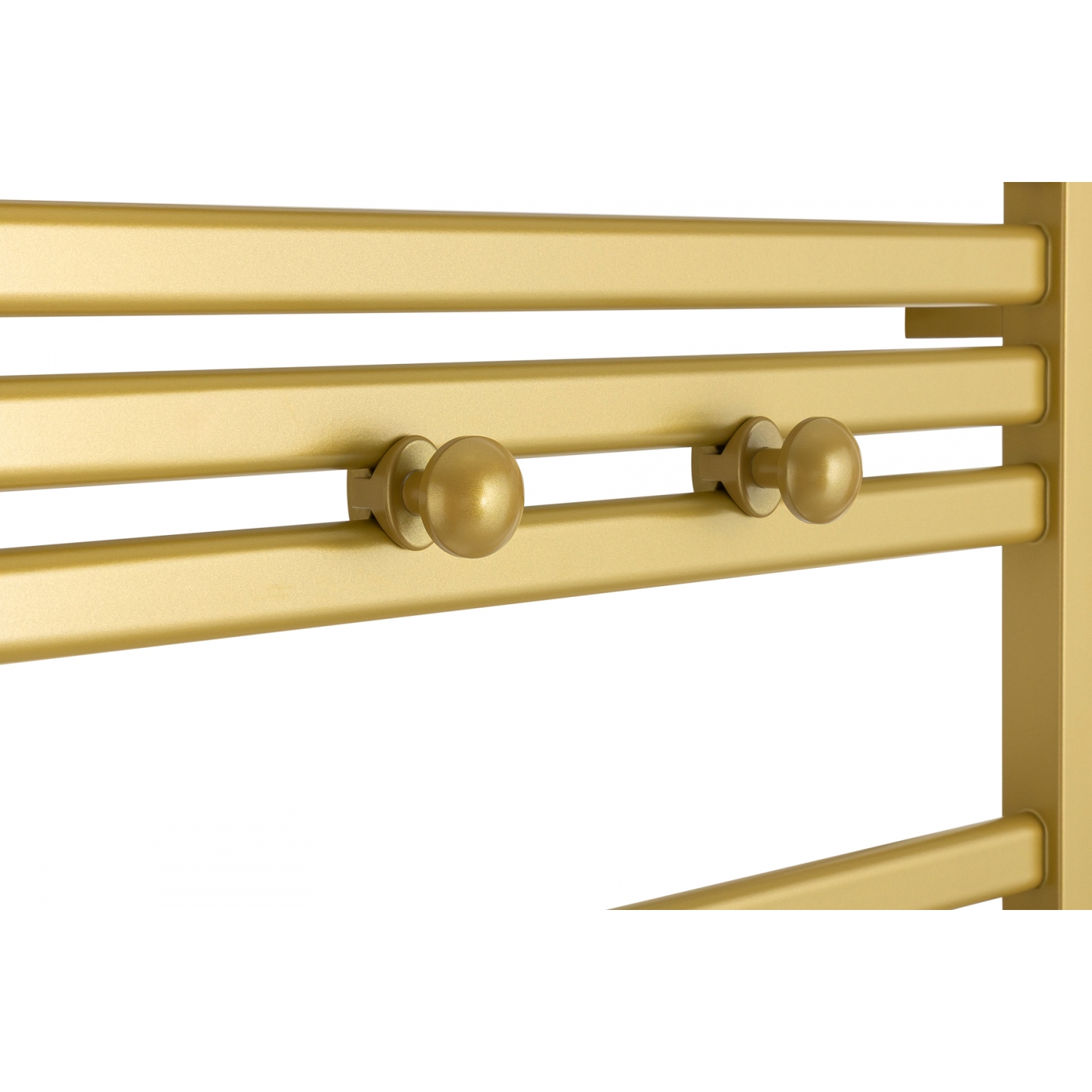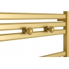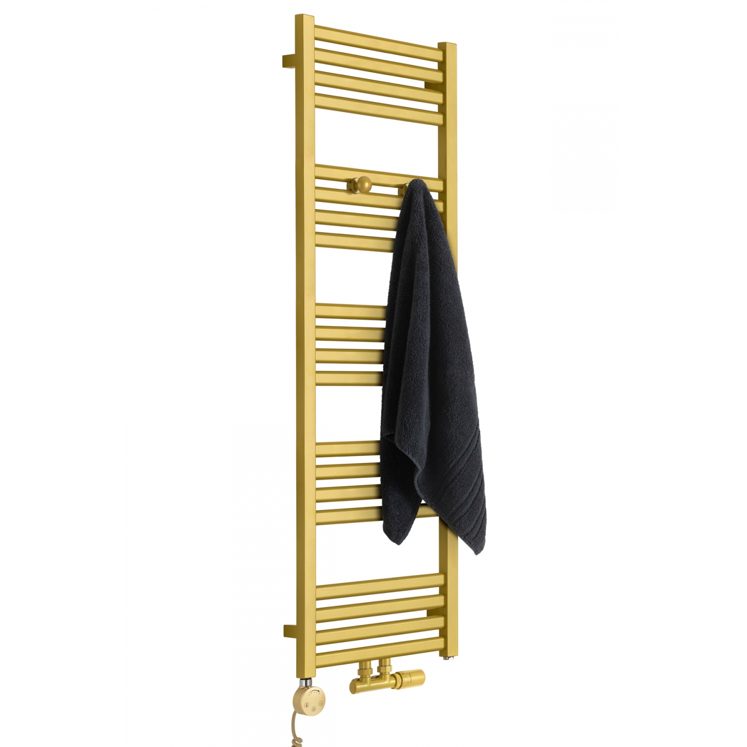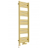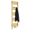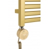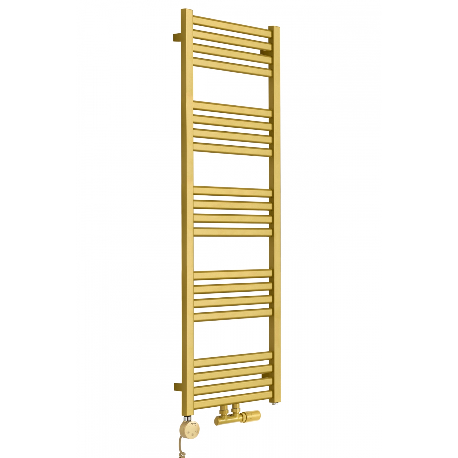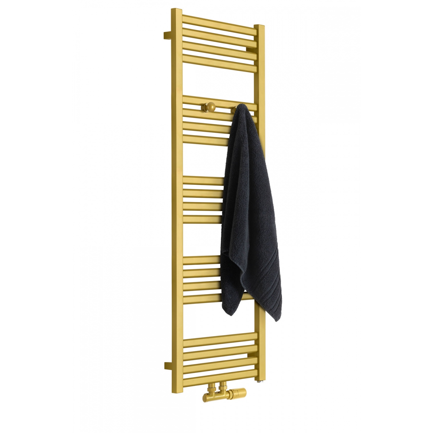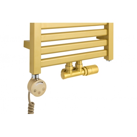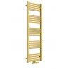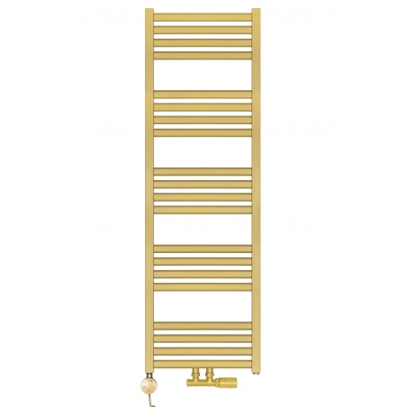 Grzejnik łazienkowy o nowoczesnym kształcie zbudowany z pionowych profili o kwadratowym przekroju i płaskich prostokątnych listew poziomych. Doskonale wkomponuje się we wnętrza współczesnych łazienek. Wersja w kolorze złotym o wymiarach 127x40cm i mocy 424W z podłączeniem dolnym środkowym D50.