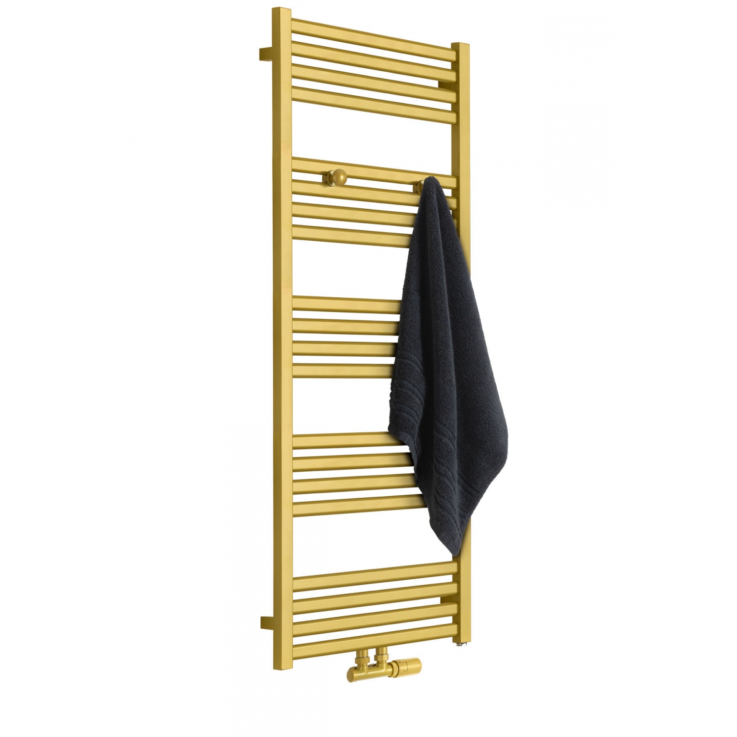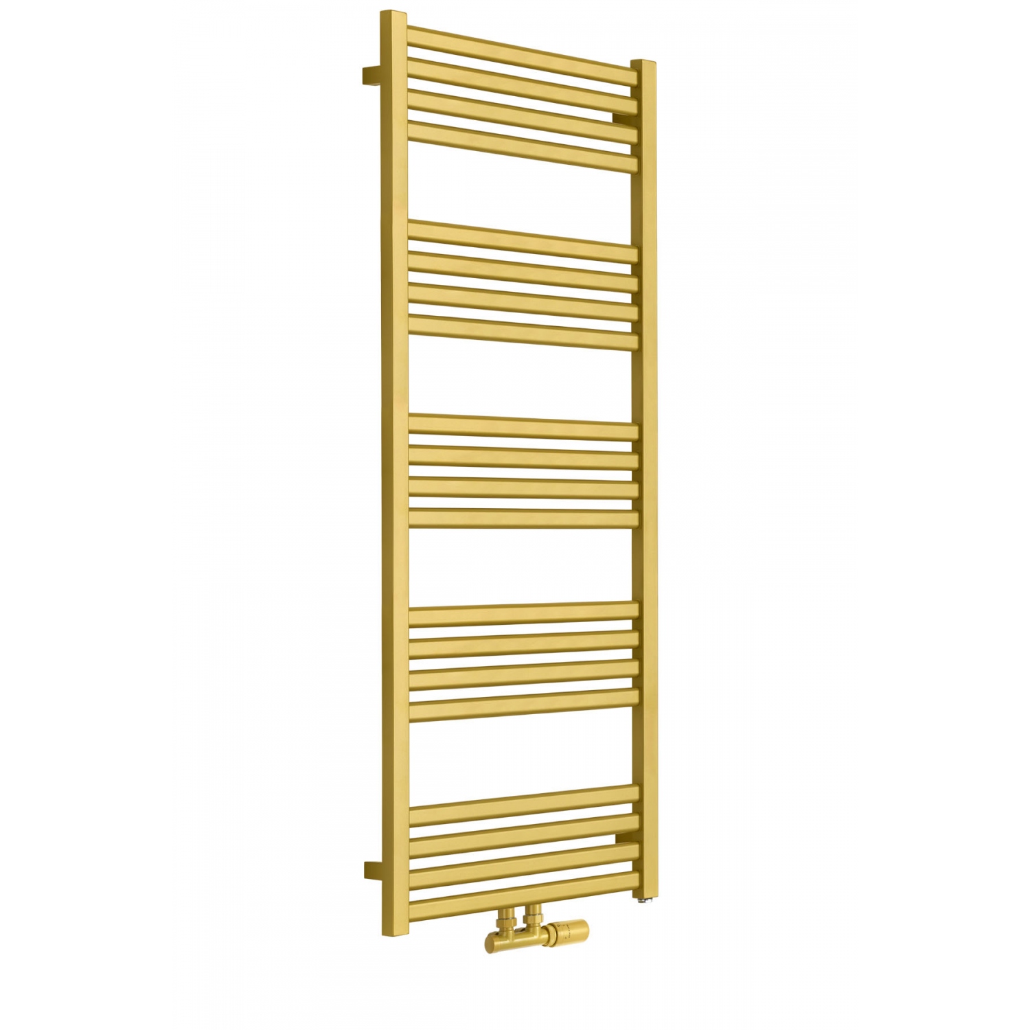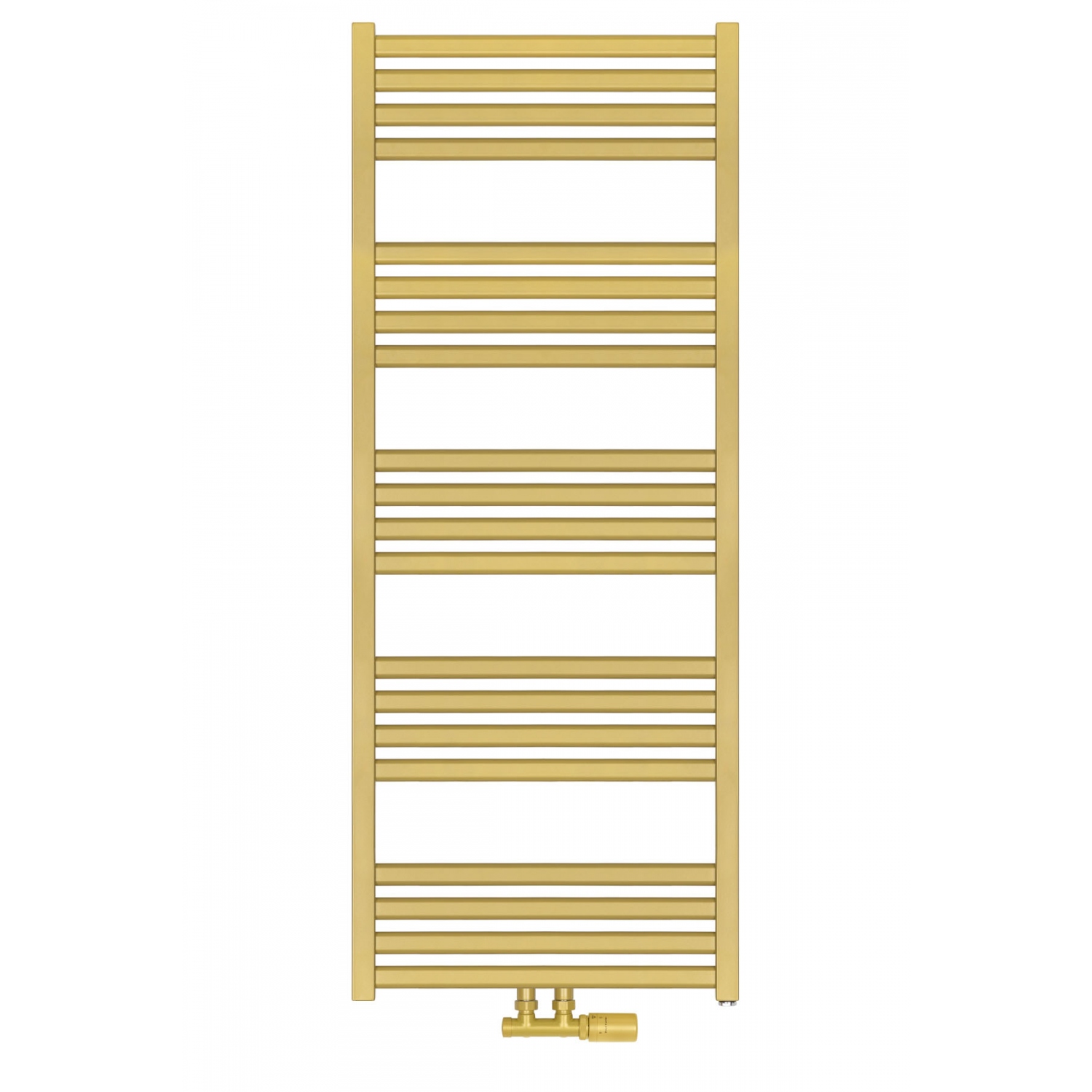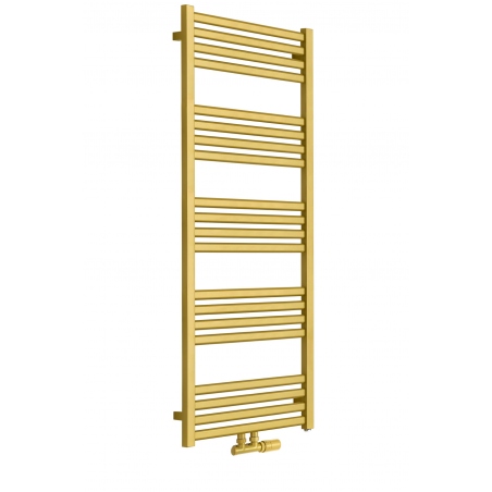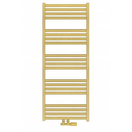 Grzejnik łazienkowy o nowoczesnym kształcie zbudowany z pionowych profili o kwadratowym przekroju i płaskich prostokątnych listew poziomych. Doskonale wkomponuje się we wnętrza współczesnych łazienek. Wersja w kolorze złotym o wymiarach 127x50cm i mocy 545W z podłączeniem dolnym środkowym D50.