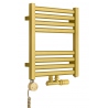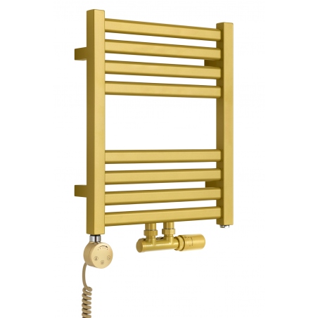 Grzejnik łazienkowy o nowoczesnym kształcie zbudowany z pionowych profili o kwadratowym przekroju i płaskich prostokątnych listew poziomych. Doskonale wkomponuje się we wnętrza współczesnych łazienek. Wersja w kolorze złotym o wymiarach 48x40cm i mocy 199W z podłączeniem dolnym środkowym D50.
