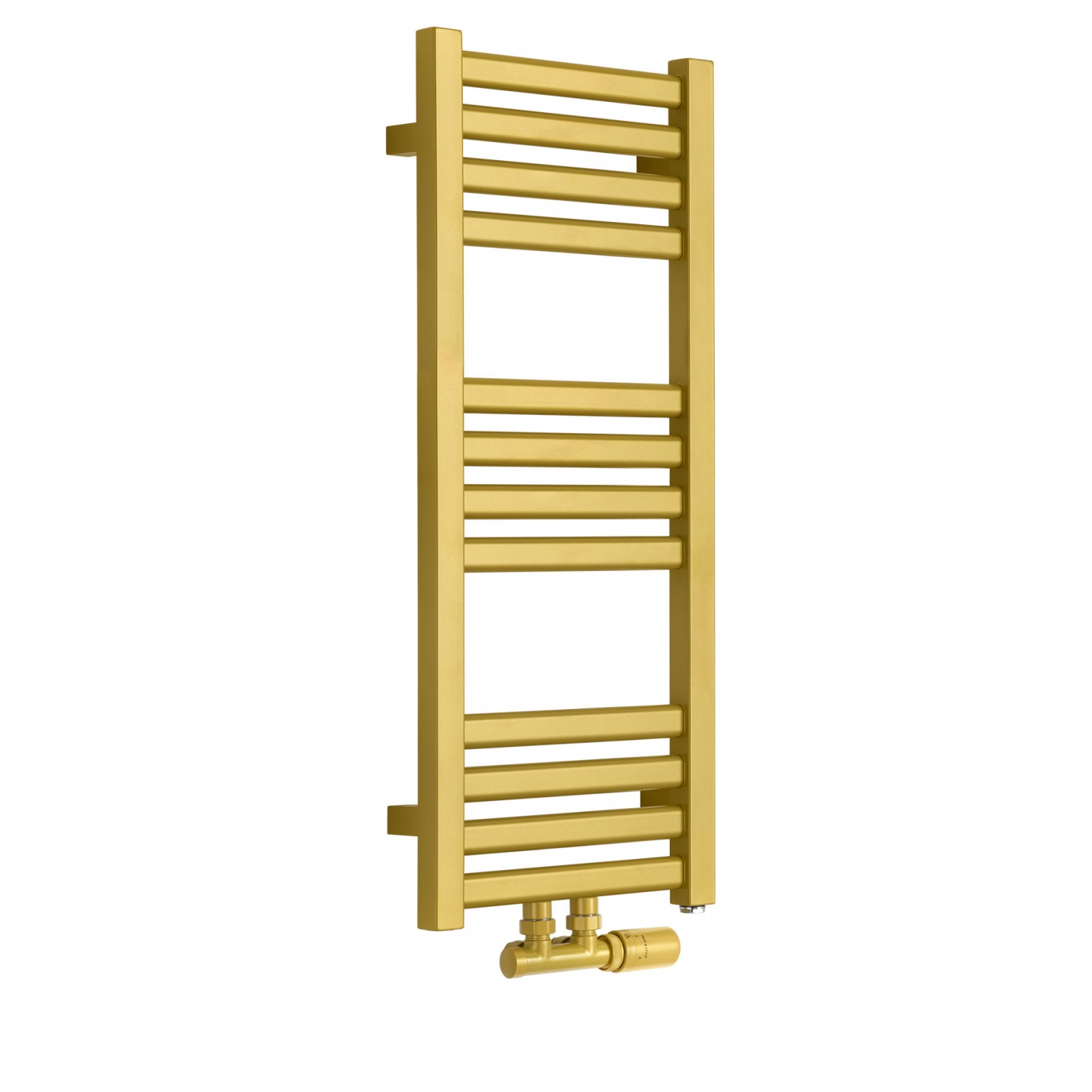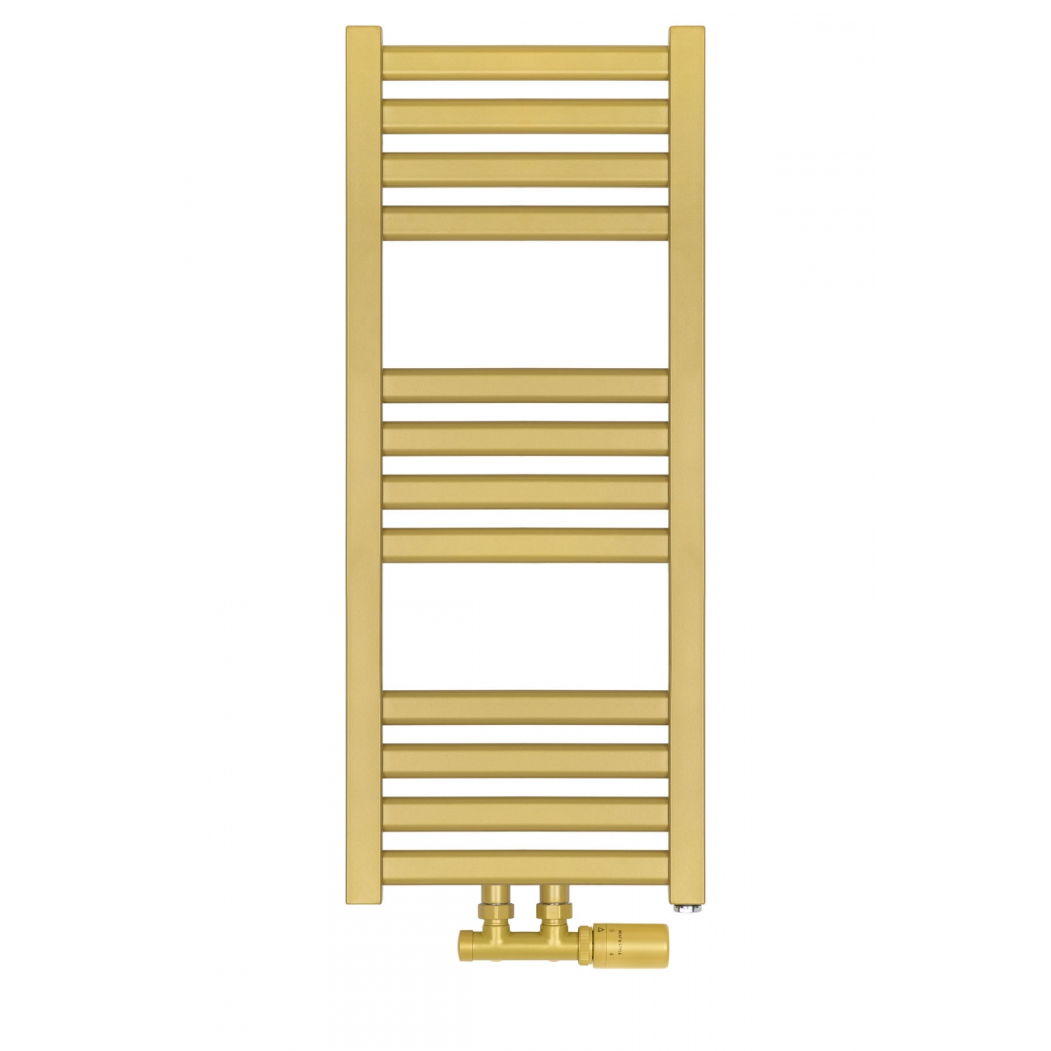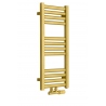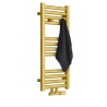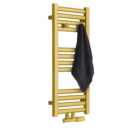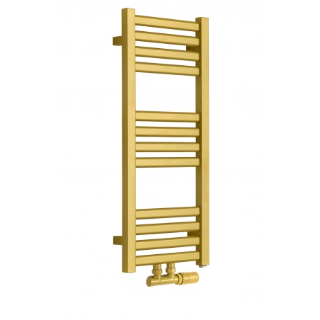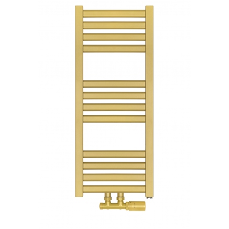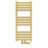 Grzejnik łazienkowy o nowoczesnym kształcie zbudowany z pionowych profili o kwadratowym przekroju i płaskich prostokątnych listew poziomych. Doskonale wkomponuje się we wnętrza współczesnych łazienek. Wersja w kolorze złotym o wymiarach 73x30cm i mocy 234W z podłączeniem dolnym środkowym D50.