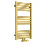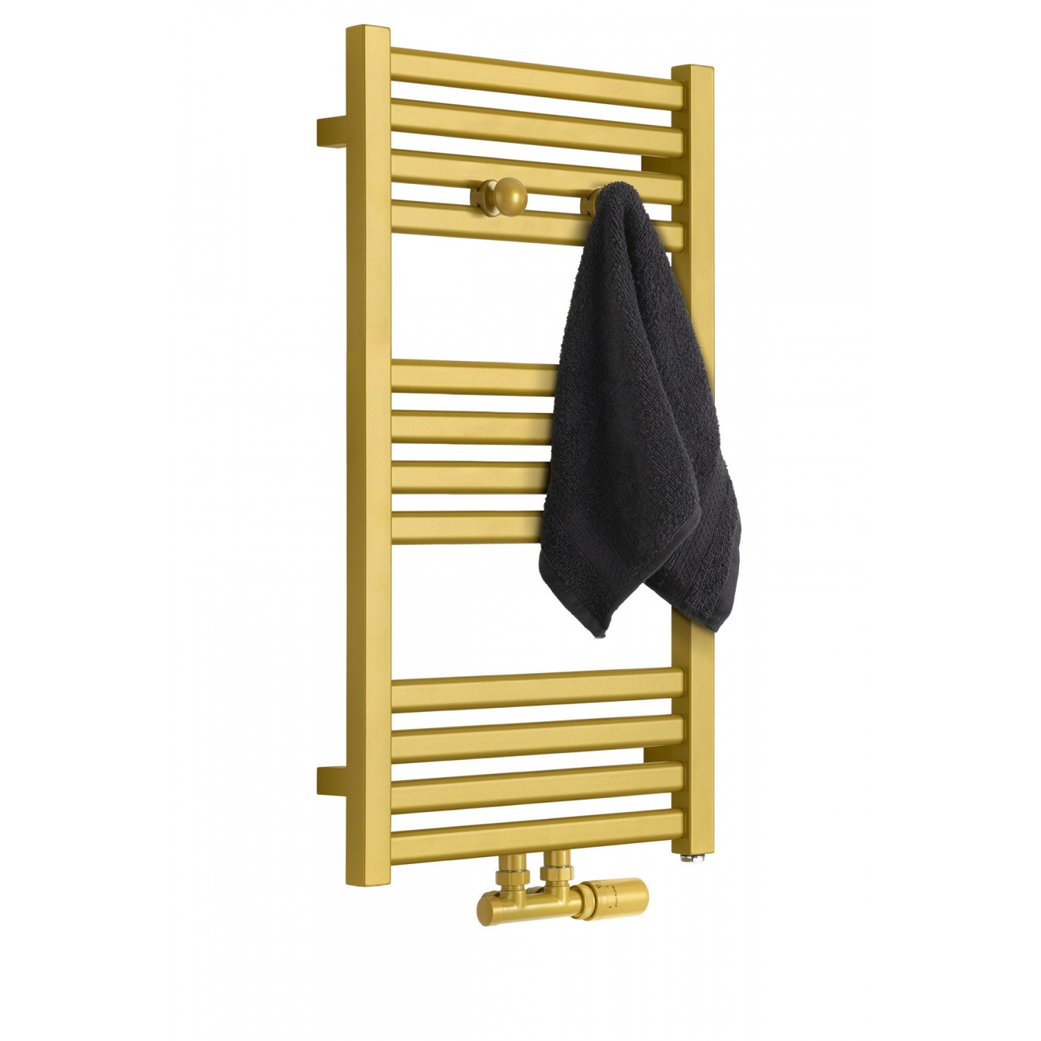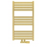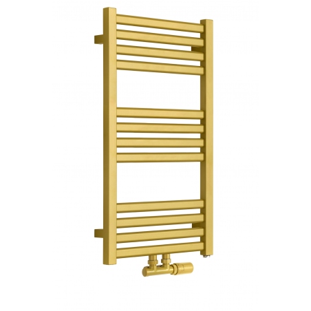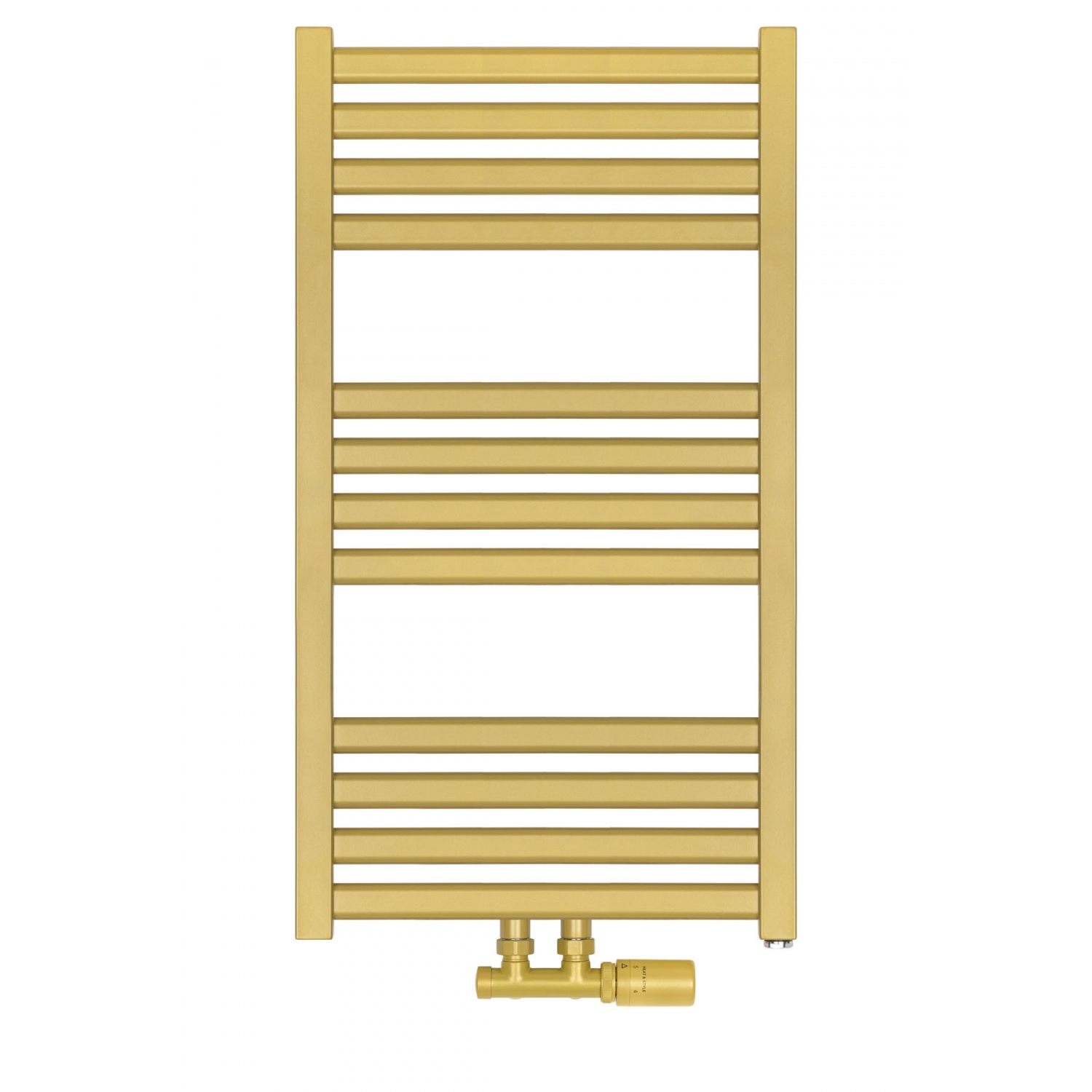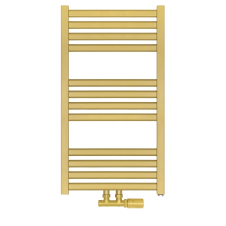 Grzejnik łazienkowy o nowoczesnym kształcie zbudowany z pionowych profili o kwadratowym przekroju i płaskich prostokątnych listew poziomych. Doskonale wkomponuje się we wnętrza współczesnych łazienek. Wersja w kolorze złotym o wymiarach 73x40cm i mocy 234W z podłączeniem dolnym środkowym D50.