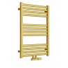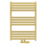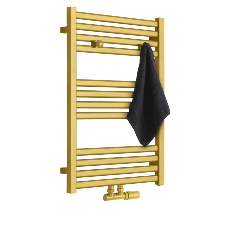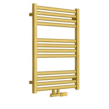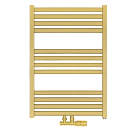 Grzejnik łazienkowy o nowoczesnym kształcie zbudowany z pionowych profili o kwadratowym przekroju i płaskich prostokątnych listew poziomych. Doskonale wkomponuje się we wnętrza współczesnych łazienek. Wersja w kolorze złotym o wymiarach 73x50cm i mocy 330W z podłączeniem dolnym środkowym D50.