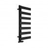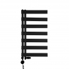 Nowoczesny grzejnik łazienkowy o zbudowany z prostokątnych listew. Asymetryczne usytuowanie pionowych kolektorów grzejnika nadaje mu dekoracyjnego charakteru, a jednocześnie pozwala na łatwiejsze przewieszanie ręczników. Grzejnik w kolorze czarnym idealny do małej łazienki.