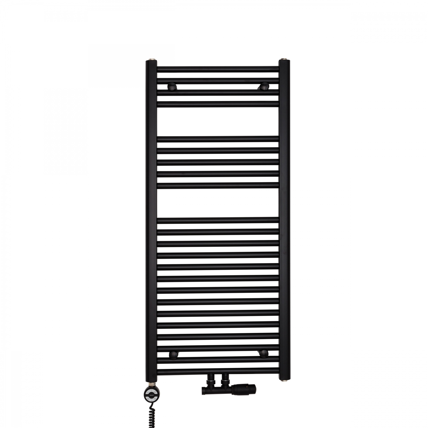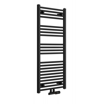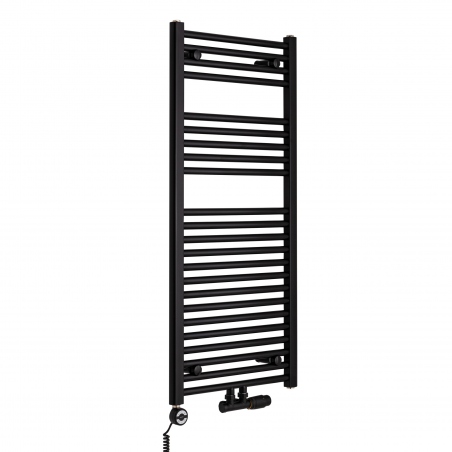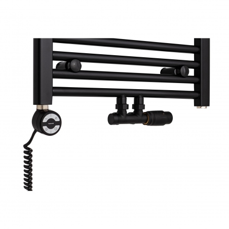 W skład zestawu wchodzi: grzejnik łazienkowy Constans 1140x500 czarny z podłączeniem dolnym D50 środkowym, zawór termostatyczny Multiflow New czarny w figurze kątowej prawej, oraz grzałka Moa 600W czarna.
