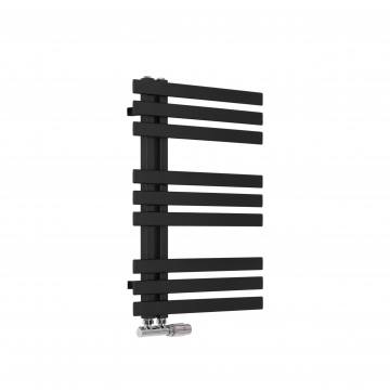 Nowoczesny grzejnik łazienkowy o zbudowany z prostokątnych listew. Asymetryczne usytuowanie pionowych kolektorów grzejnika nadaje mu dekoracyjnego charakteru, a jednocześnie pozwala na łatwiejsze przewieszanie ręczników.
