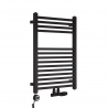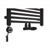 W skład zestawu wchodzi: grzejnik łazienkowy Essence 700x500 czarny z podłączeniem dolnym D50 środkowym, zawór termostatyczny Multiflow New czarny w figurze kątowej prawej, oraz grzałka Samba 300W czarna.