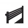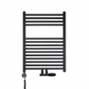 W skład zestawu wchodzi: grzejnik łazienkowy Essence 700x500 czarny z podłączeniem dolnym D50 środkowym, zawór termostatyczny Multiflow czarny w figurze kątowej prawej, oraz grzałka Rumba 300W czarna.