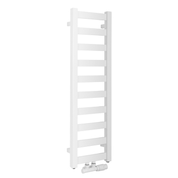 W zestawie grzejnik, zawór termostatyczny zespolony Multiflow w figurze kątowej prawej oraz grzałka Rumba 300W, kolor biały