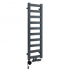 Grzejnik łazienkowy o nowoczesnym kształcie zbudowany z pionowych profili o kwadratowym przekroju i płaskich prostokątnych listew poziomych. Doskonale wkomponuje się we wnętrza współczesnych łazienek. Wersja w kolorze grafitowym, o wymiarach 97x30cm i mocy 293W z podłączeniem dolnym środkowym.