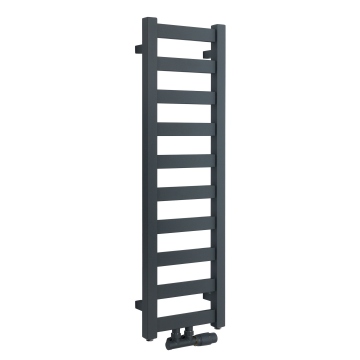 Grzejnik łazienkowy o nowoczesnym kształcie zbudowany z pionowych profili o kwadratowym przekroju i płaskich prostokątnych listew poziomych. Doskonale wkomponuje się we wnętrza współczesnych łazienek. Wersja w kolorze grafitowym o wymiarach 97x30cm i mocy 293W z podłączeniem dolnym środkowym.