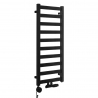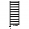 W zestawie grzejnik, zawór termostatyczny zespolony Multiflow w figurze kątowej prawej oraz grzałka Rumba 300W, kolor czarny