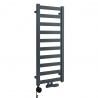 Grzejnik łazienkowy o nowoczesnym kształcie zbudowany z pionowych profili o kwadratowym przekroju i płaskich prostokątnych listew poziomych. Doskonale wkomponuje się we wnętrza współczesnych łazienek. Wersja w kolorze grafitowym o wymiarach 97x40cm i mocy 360W z podłączeniem dolnym środkowym.