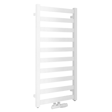 W zestawie grzejnik, zawór termostatyczny zespolony Multiflow w figurze kątowej prawej oraz grzałka Rumba 400W, kolor biały