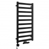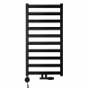 W zestawie grzejnik, zawór termostatyczny zespolony Multiflow New w figurze kątowej prawej oraz grzałka Samba 400W, kolor czarny.