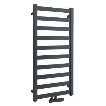 Grzejnik łazienkowy o nowoczesnym kształcie zbudowany z pionowych profili o kwadratowym przekroju i płaskich prostokątnych listew poziomych. Doskonale wkomponuje się we wnętrza współczesnych łazienek. Wersja w kolorze grafitowym, o wymiarach 97x50cm i mocy 414W z podłączeniem dolnym środkowym.