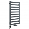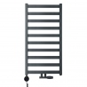 Grzejnik łazienkowy o nowoczesnym kształcie zbudowany z pionowych profili o kwadratowym przekroju i płaskich prostokątnych listew poziomych. Doskonale wkomponuje się we wnętrza współczesnych łazienek. Wersja w kolorze grafitowym, o wymiarach 97x50cm i mocy 414W z podłączeniem dolnym środkowym.