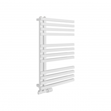 Nowoczesny grzejnik łazienkowy o zbudowany z prostokątnych listew. Asymetryczne usytuowanie pionowych kolektorów grzejnika nadaje mu dekoracyjnego charakteru, a jednocześnie pozwala na łatwiejsze przewieszanie ręczników.