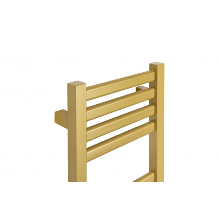 Grzejnik łazienkowy o nowoczesnym kształcie zbudowany z pionowych profili o kwadratowym przekroju i płaskich prostokątnych listew poziomych. Doskonale wkomponuje się we wnętrza współczesnych łazienek. Wersja w kolorze złotym o wymiarach 100x30cm i mocy 302W z podłączeniem dolnym środkowym D50.