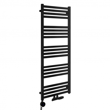 Grzejnik łazienkowy o nowoczesnym kształcie zbudowany z pionowych profili o kwadratowym przekroju i płaskich prostokątnych listew poziomych. Doskonale wkomponuje się we wnętrza współczesnych łazienek. Wersja w kolorze czarnym o wymiarach 127x50cm i mocy 545W z podłączeniem dolnym środkowym.