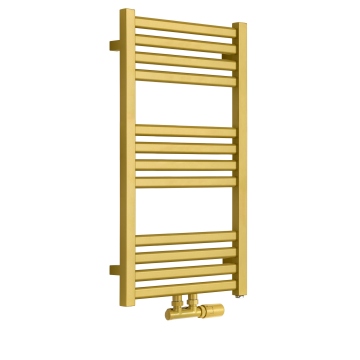 Grzejnik łazienkowy o nowoczesnym kształcie zbudowany z pionowych profili o kwadratowym przekroju i płaskich prostokątnych listew poziomych. Doskonale wkomponuje się we wnętrza współczesnych łazienek. Wersja w kolorze złotym o wymiarach 73x40cm i mocy 234W z podłączeniem dolnym środkowym D50.