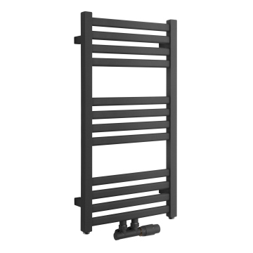 W zestawie grzejnik, zawór termostatyczny zespolony Multiflow New w figurze kątowej prawej oraz grzałka Samba 300Ww kolorze czarnym.