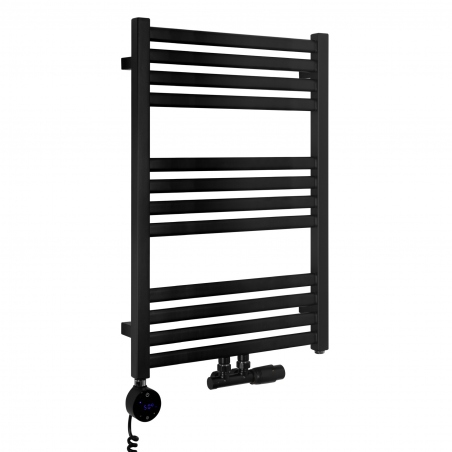 Grzejnik łazienkowy o nowoczesnym kształcie zbudowany z pionowych profili o kwadratowym przekroju i płaskich prostokątnych listew poziomych. Doskonale wkomponuje się we wnętrza współczesnych łazienek. Wersja w kolorze czarnym o wymiarach 73x50cm i mocy 330W z podłączeniem dolnym środkowym.