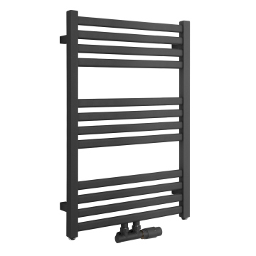 W zestawie grzejnik, zawór termostatyczny zespolony Multiflow w figurze kątowej prawej oraz grzałka Rumba 300W w kolorze czarnym.