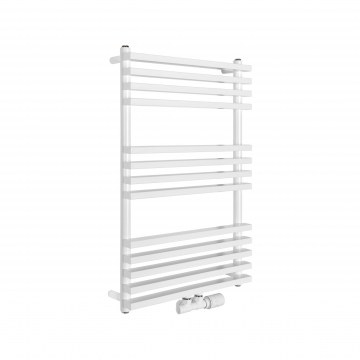 Grzejnik łazienkowy o nowoczesnym kształcie zbudowany z pionowych profili o kwadratowym przekroju i płaskich prostokątnych listew poziomych. Doskonale wkomponuje się we wnętrza współczesnych łazienek. Wersja w kolorze białym o wymiarach 80x50cm i mocy 368W z podłączeniem dolnym środkowym.