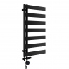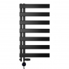 Nowoczesny grzejnik łazienkowy o zbudowany z prostokątnych listew. Asymetryczne usytuowanie pionowych kolektorów grzejnika nadaje mu dekoracyjnego charakteru, a jednocześnie pozwala na łatwiejsze przewieszanie ręczników. Grzejnik o wymiarach 90x50cm o mocy 360W w kolorze czarnym idealny do małej łazienki.