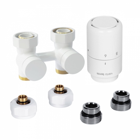 Zestaw przyłączeniowy odpowiedni do dekoracyjnych grzejników panelowych np z serii Space Line. Figura prosta, kolor biały. W komplecie głowica termostatyczna pasująca do wkładek z gwintem M30x1,5, dwa nyple redukcyjne oraz dwie złączki do rur z tworzywa PEX16x2.