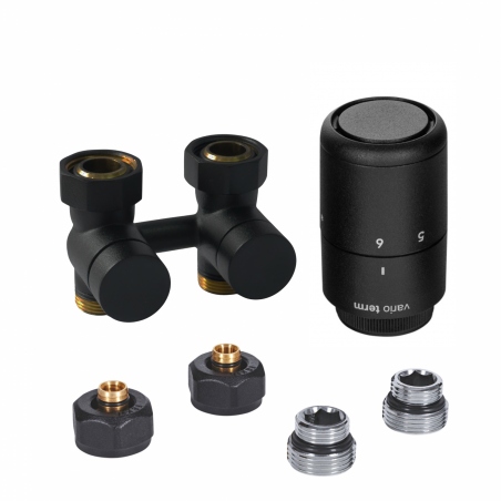 Zestaw przyłączeniowy odpowiedni do dekoracyjnych grzejników panelowych np z serii Space Line. Figura prosta, kolor czarny. W komplecie głowica termostatyczna pasująca do wkładek z gwintem M30x1,5, dwa nyple redukcyjne oraz dwie złączki do rur z tworzywa PEX16x2.