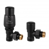 Zestaw termostatyczny odpowiednie do przyłączania grzejników łazienkowych i pokojowych z podłączeniem bocznym. Figura kątowa, kolor czarny. W komplecie głowica termostatyczna z serii Tucan.