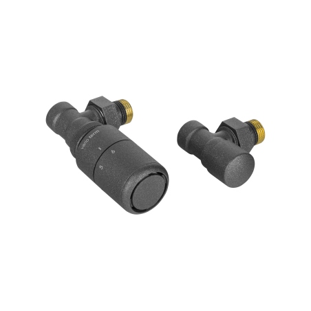 Zestaw termostatyczny odpowiednie do przyłączania grzejników łazienkowych i pokojowych z podłączeniem bocznym. Figura kątowa, kolor metallic grey. W komplecie głowica termostatyczna z serii Tucan.